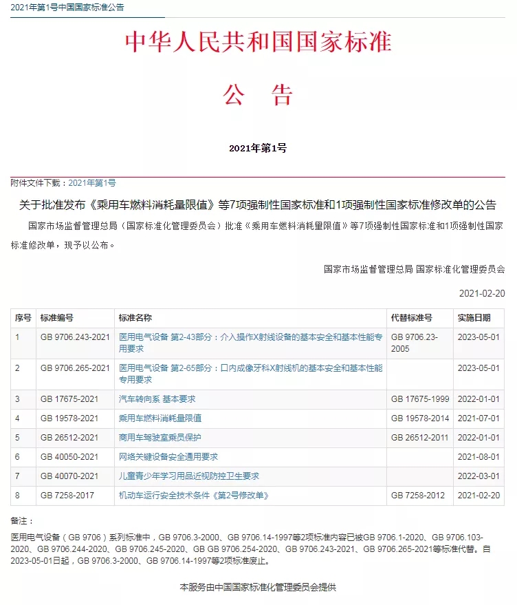 2021年2月20日,工业和信息化部组织制定的《乘用车燃料消耗量限值》强制性国家标准(GB19578-2021)由国家市场监督管理总局、国家标准化管理委员会批准发布,于2021年7月1日起正式实施。