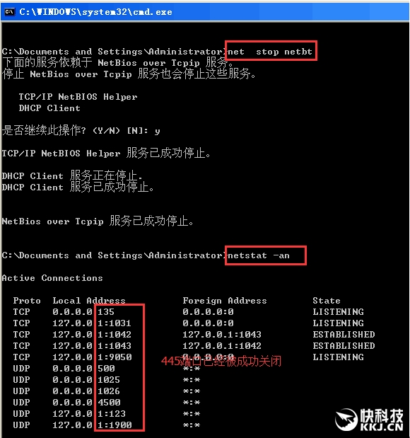 (b)、如上图假如445端口开启,依次输入以下命令进行关闭: